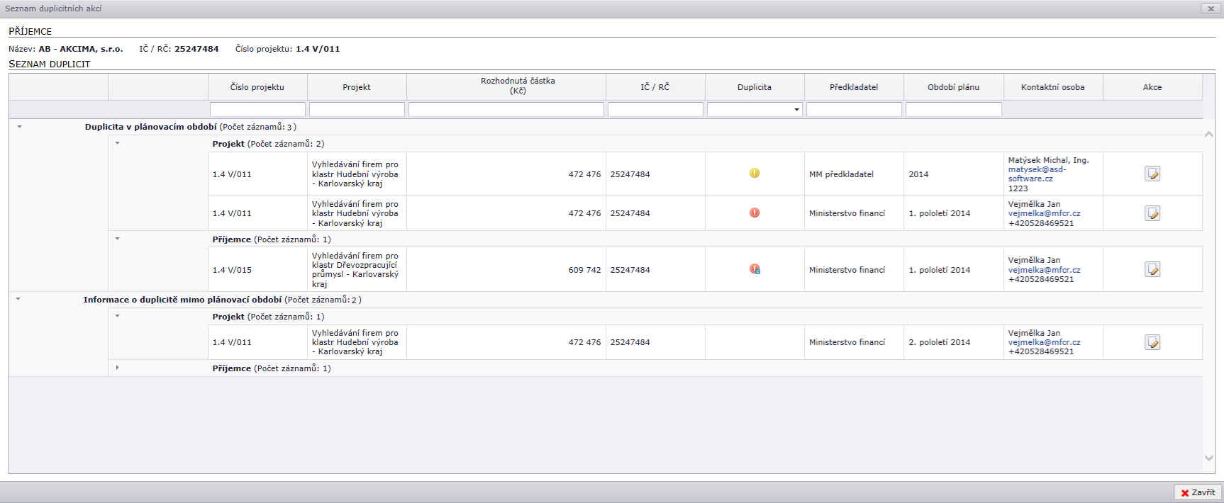 Sekce "Seznam duplicit" – zobrazuje všechny duplicity na příjemce či projekt příjemce. Seznam je rozdělen na dvě úrovně „Duplicity v plánovaném období“ a „Informace o duplicitě mimo plánovací období“. Každá z těchto úrovní je navíc rozdělena na duplicitní záznamy dle „Projektu“ a „Příjemce“. oDuplicity – jedná se o duplicitní kontrolní akce v plánovacím období. oInformace – jedná se o duplicitní kontrolní akce mimo plánovací období. Seznam duplicit/informací obsahuje sloupce: oČíslo projektu – číslo projektu. oNázev projektu – název projektu. oProgram – název programu či operačního programu projektu. oRozhodnutá částka – výše rozhodnuté částky dotace v Kč. oIČ/RČ – dle typu právní formy příjemce dotace je uvedeno IČ nebo RČ příjemce. oDuplicita – indikace duplicity a její úrovně: